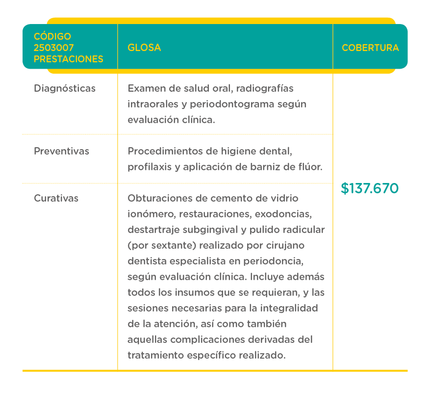 Este PAD (pago asociado a diagnóstico) código 2503007, incorpora procedimientos y acciones odontológicas generales y de especialidad de Periodoncia que son detallados en el siguiente cuadro, junto a su respectiva cobertura:
